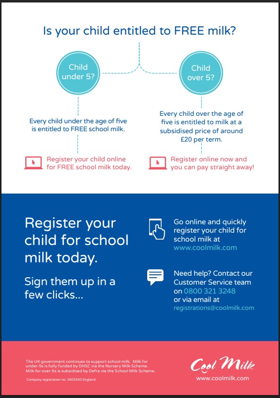 In conjunction with the Department of Education's new School Food Plan, our school takes part in a scheme offered by Coolmilk to provide a 189ml portion of low-fat milk to children in school. The milk is free for children under 5 and every child over the age of 5 is entitled to milk at a subsidised price of around £20 per term.